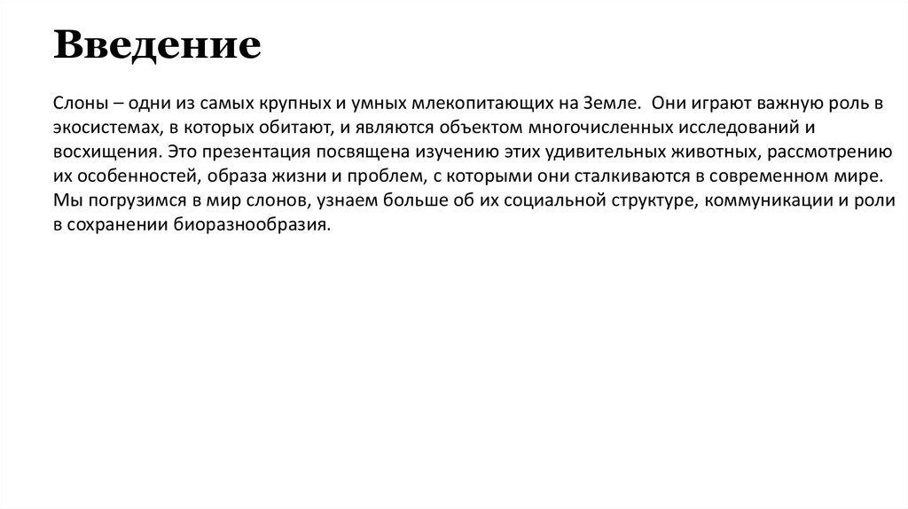 ВведениеСлоны – одни из самых крупных и умных млекопитающих на Земле. Они играют важную роль в