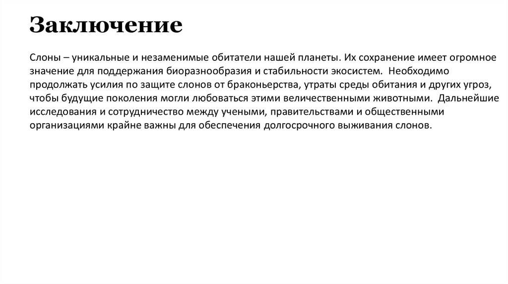 ЗаключениеСлоны – уникальные и незаменимые обитатели нашей планеты. Их сохранение имеет огромное