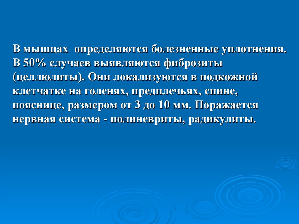 В мышцах определяются болезненные уплотнения.В 50% случаев выявляются фиброзиты