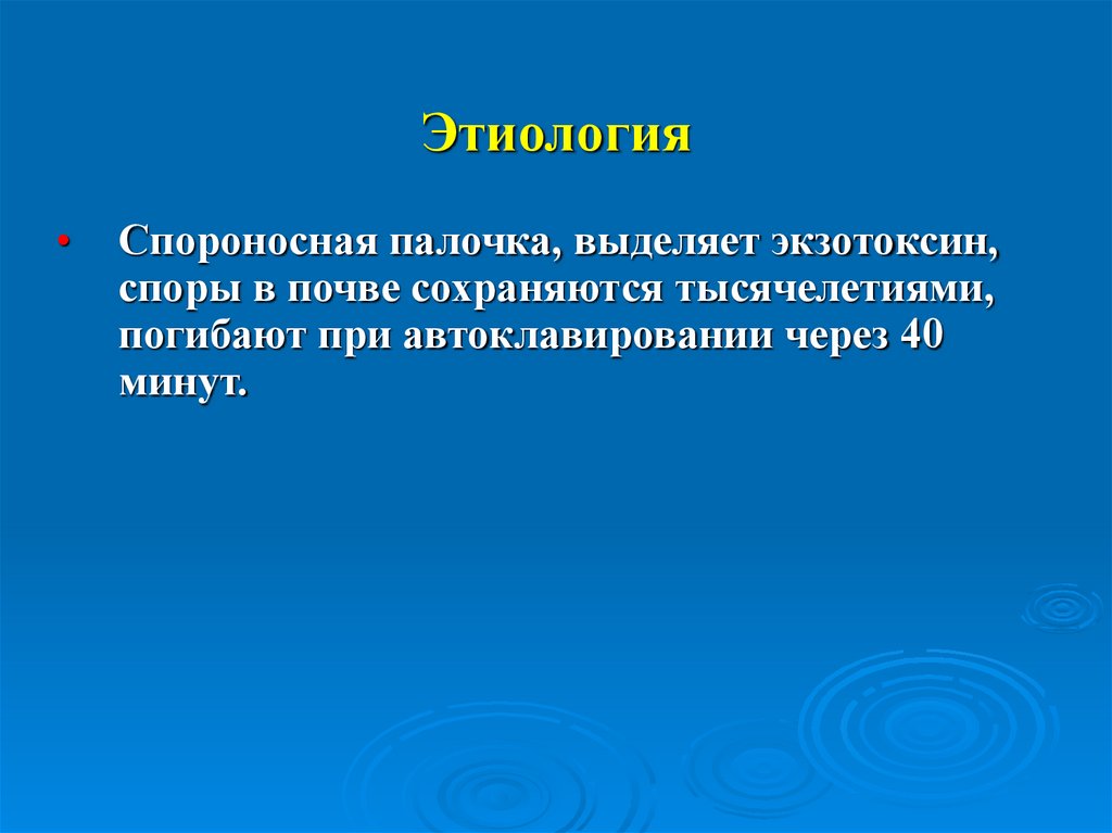 ЭтиологияСпороносная палочка, выделяет экзотоксин,