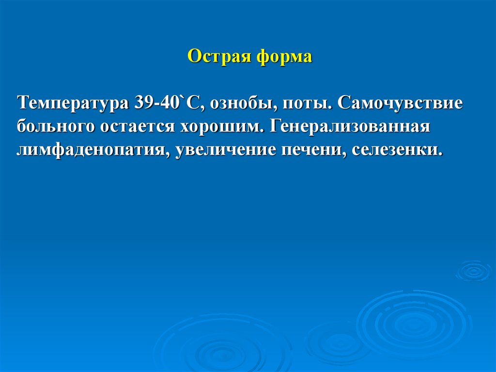 Острая формаТемпература 39-40`С, ознобы, поты. Самочувствие