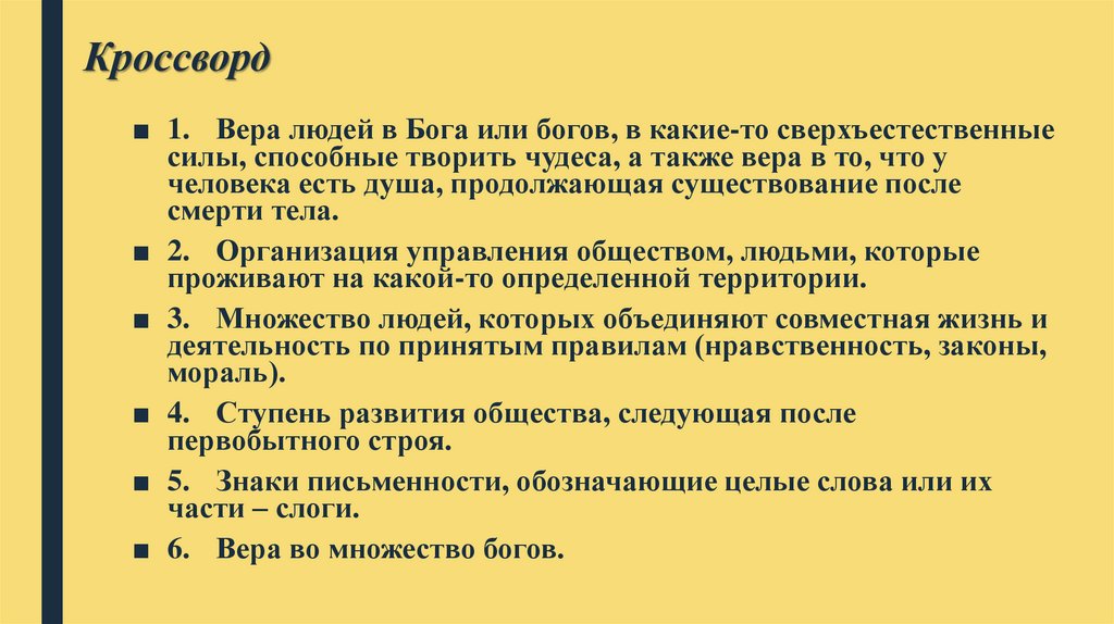 Кроссворд■ 1. Вера людей в Бога или богов, в какие-то сверхъестественные