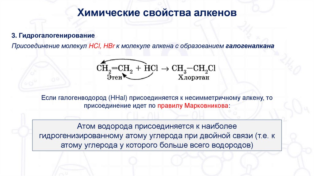 Присоединение молекул HCl, HBr к молекуле алкена с образованием галогеналкана