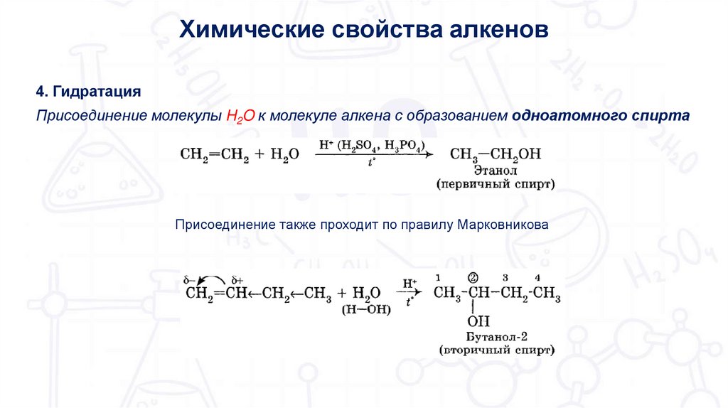 Присоединение молекулы H2O к молекуле алкена с образованием одноатомного спирта