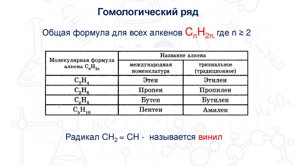 Гомологический рядОбщая формула для всех алкенов CnH2n, где n ≥ 2
