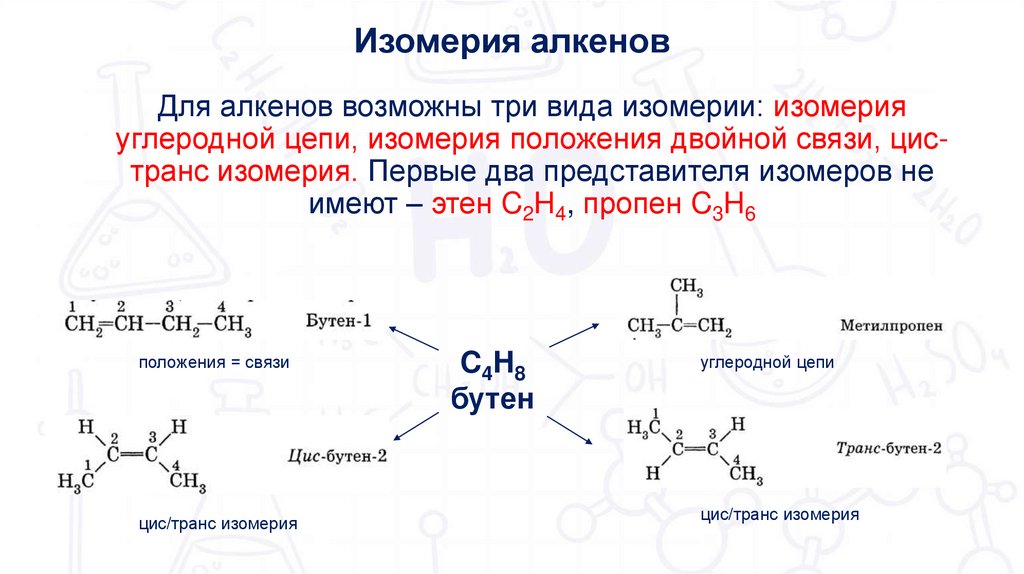 углеродной цепи, изомерия положения двойной связи, цистранс изомерия. Первые два представителя изомеров не