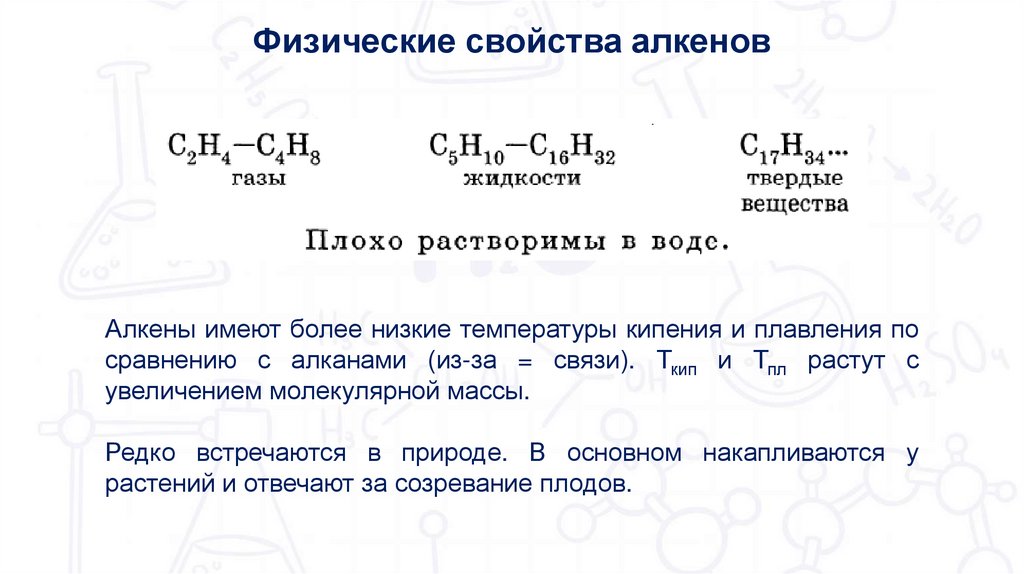 Физические свойства алкеновАлкены имеют более низкие температуры кипения и плавления по