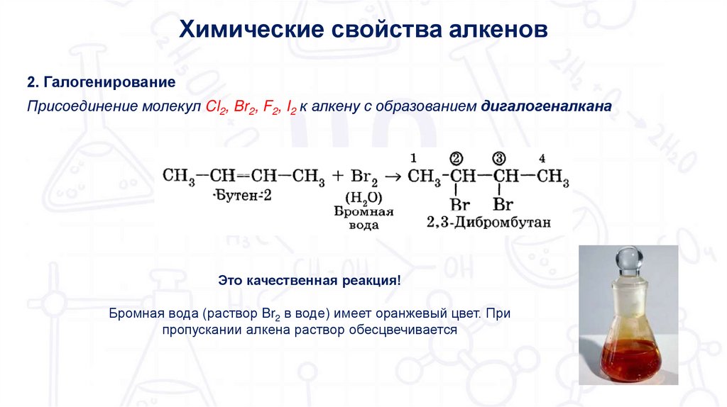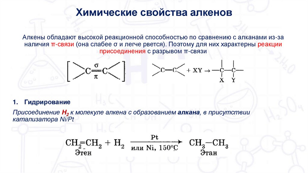 Химические свойства алкеновАлкены обладают высокой реакционной способностью по сравнению с алканами из-за
