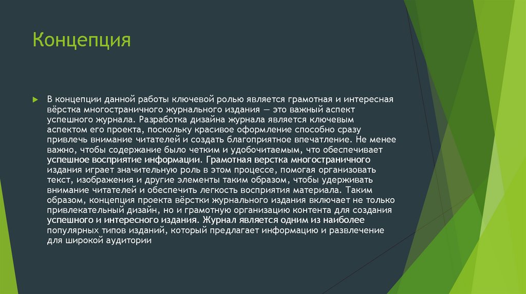 КонцепцияВ концепции данной работы ключевой ролью является грамотная и интересная