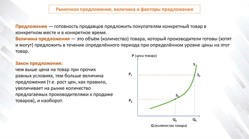 Рыночное предложение, величина и факторы предложенияПредложение — готовность продавцов предложить покупателям конкретный товар в
