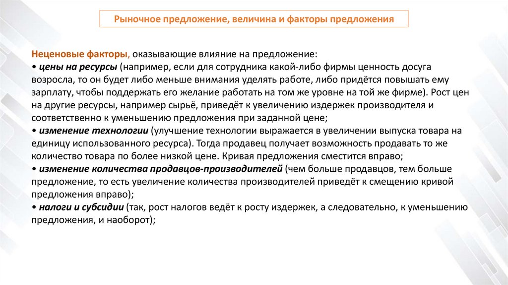 Рыночное предложение, величина и факторы предложенияНеценовые факторы, оказывающие влияние на предложение: