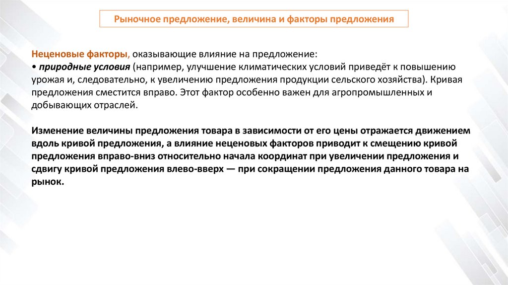предложения сместится вправо. Этот фактор особенно важен для агропромышленных и