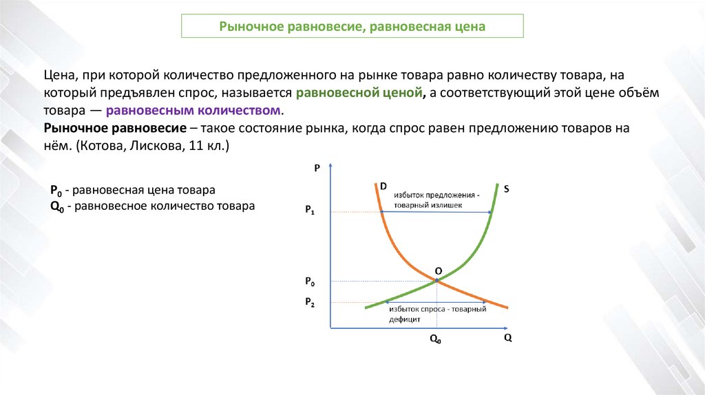 Рыночное равновесие, равновесная ценаЦена, при которой количество предложенного на рынке товара равно количеству товара, на