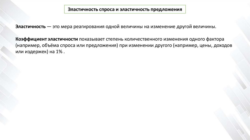 Эластичность спроса и эластичность предложенияЭластичность — это мера реагирования одной величины на изменение другой величины.