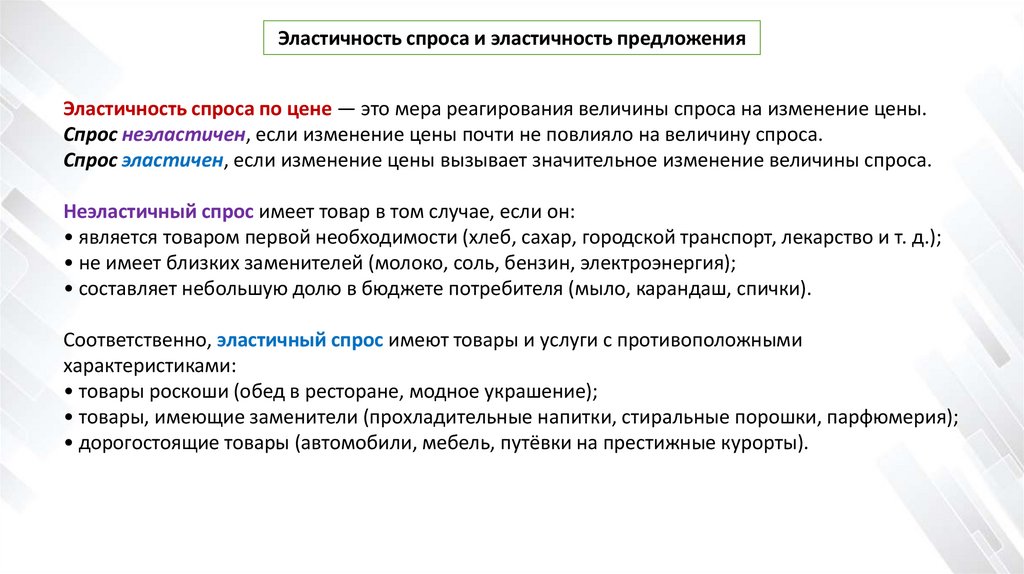 Соответственно, эластичный спрос имеют товары и услуги с противоположными