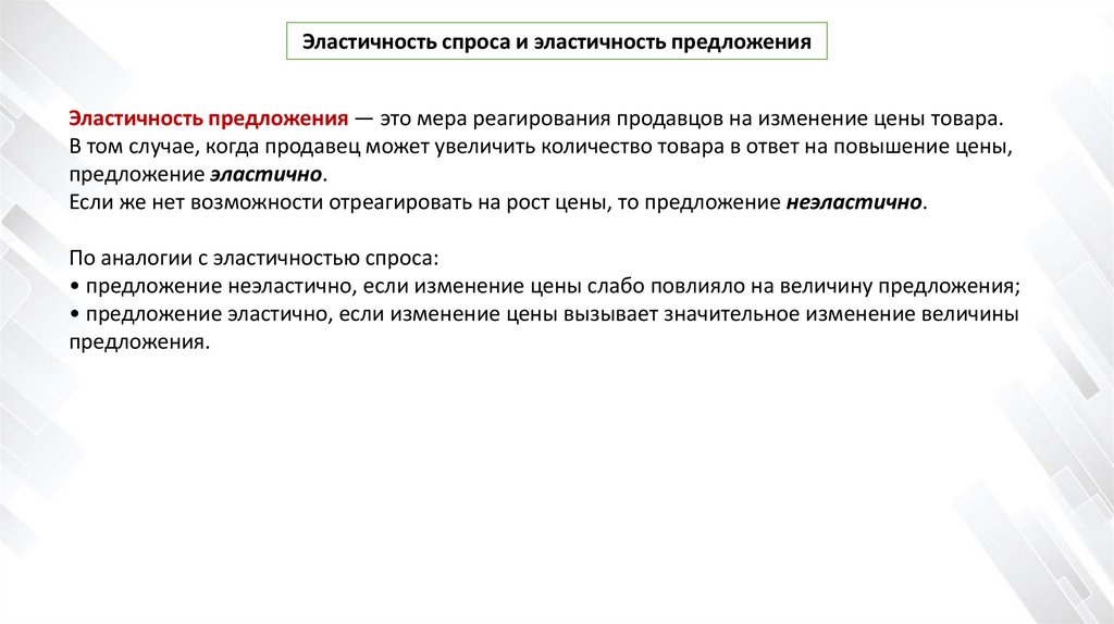 Эластичность спроса и эластичность предложенияЭластичность предложения — это мера реагирования продавцов на изменение цены товара.