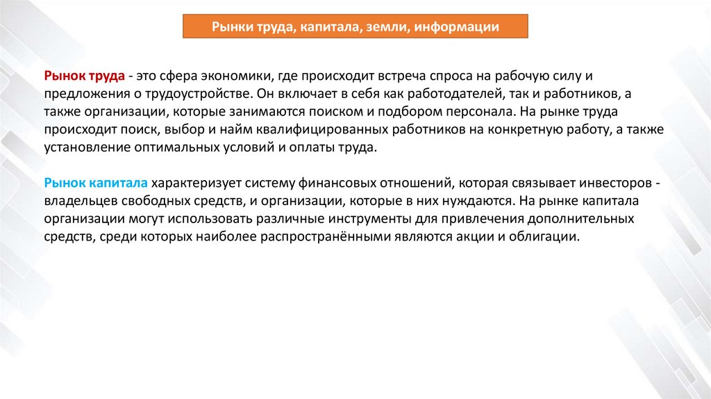 Рынки труда, капитала, земли, информацииРынок труда - это сфера экономики, где происходит встреча спроса на рабочую силу и