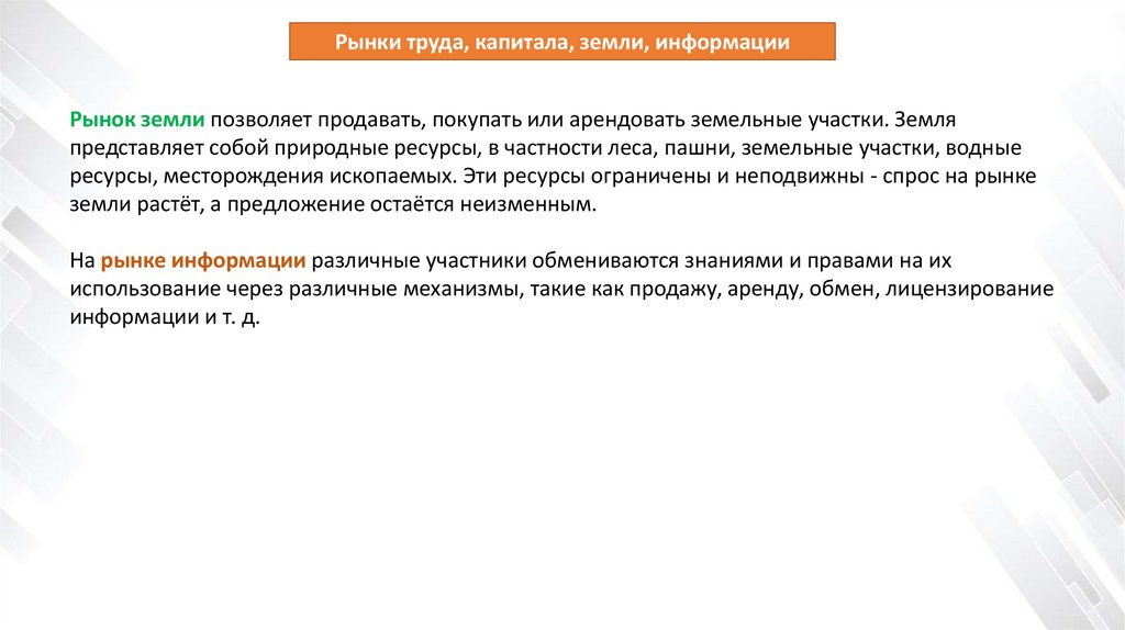 Рынки труда, капитала, земли, информацииРынок земли позволяет продавать, покупать или арендовать земельные участки. Земля