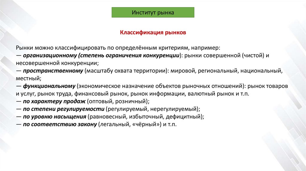 — организационному (степень ограничения конкуренции): рынки совершенной (чистой) и