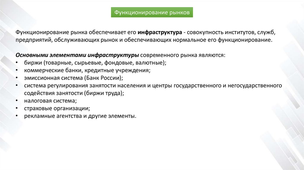 Функционирование рынковФункционирование рынка обеспечивает его инфраструктура - совокупность институтов, служб,