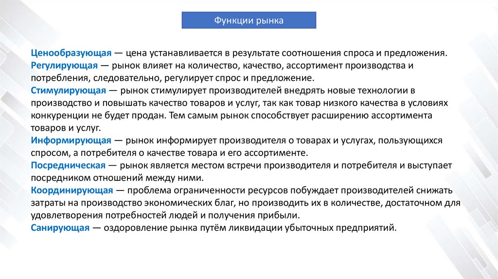 Функции рынкаЦенообразующая — цена устанавливается в результате соотношения спроса и предложения.