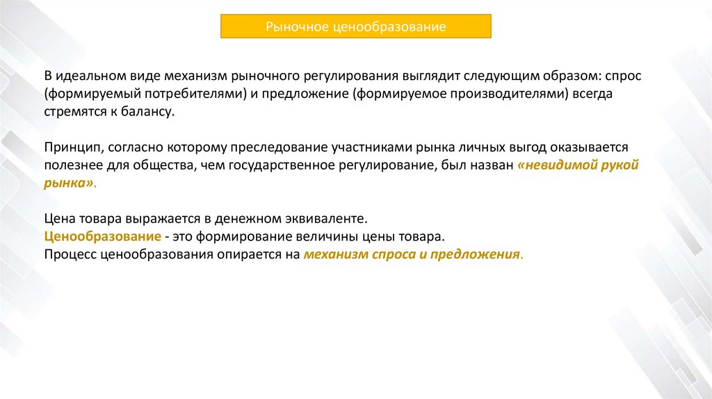 Рыночное ценообразованиеВ идеальном виде механизм рыночного регулирования выглядит следующим образом: спрос