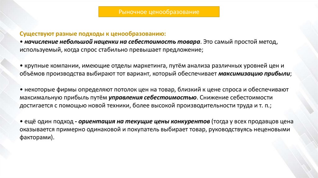 Рыночное ценообразованиеСуществуют разные подходы к ценообразованию: