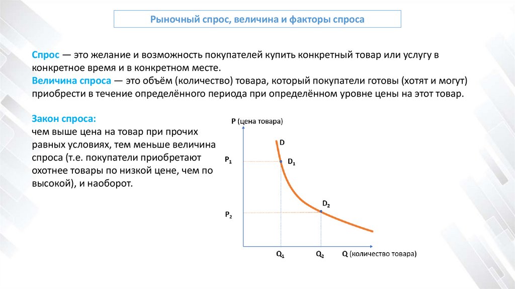 Рыночный спрос, величина и факторы спросаСпрос — это желание и возможность покупателей купить конкретный товар или услугу в