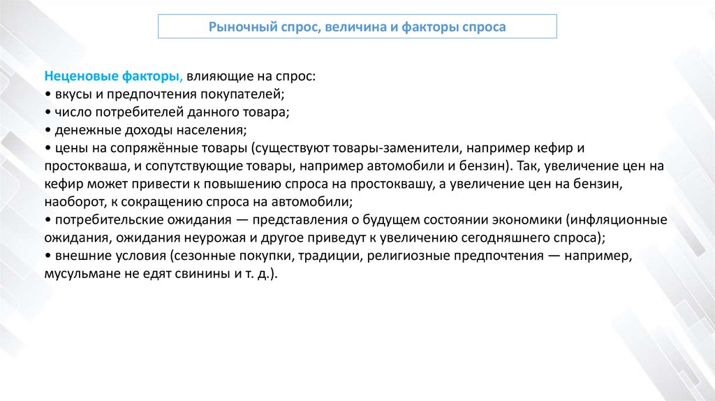 Рыночный спрос, величина и факторы спросаНеценовые факторы, влияющие на спрос: