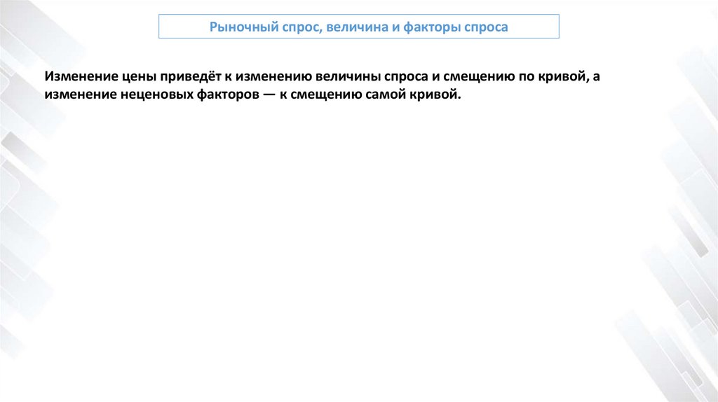 Рыночный спрос, величина и факторы спросаИзменение цены приведёт к изменению величины спроса и смещению по кривой, а