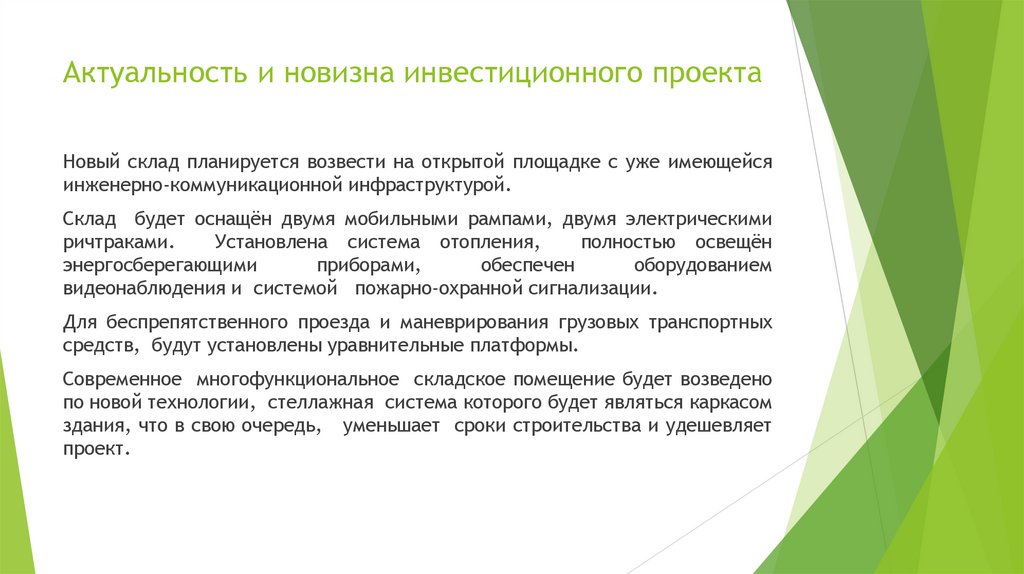 Актуальность и новизна инвестиционного проектаНовый склад планируется возвести на открытой площадке с уже имеющейся