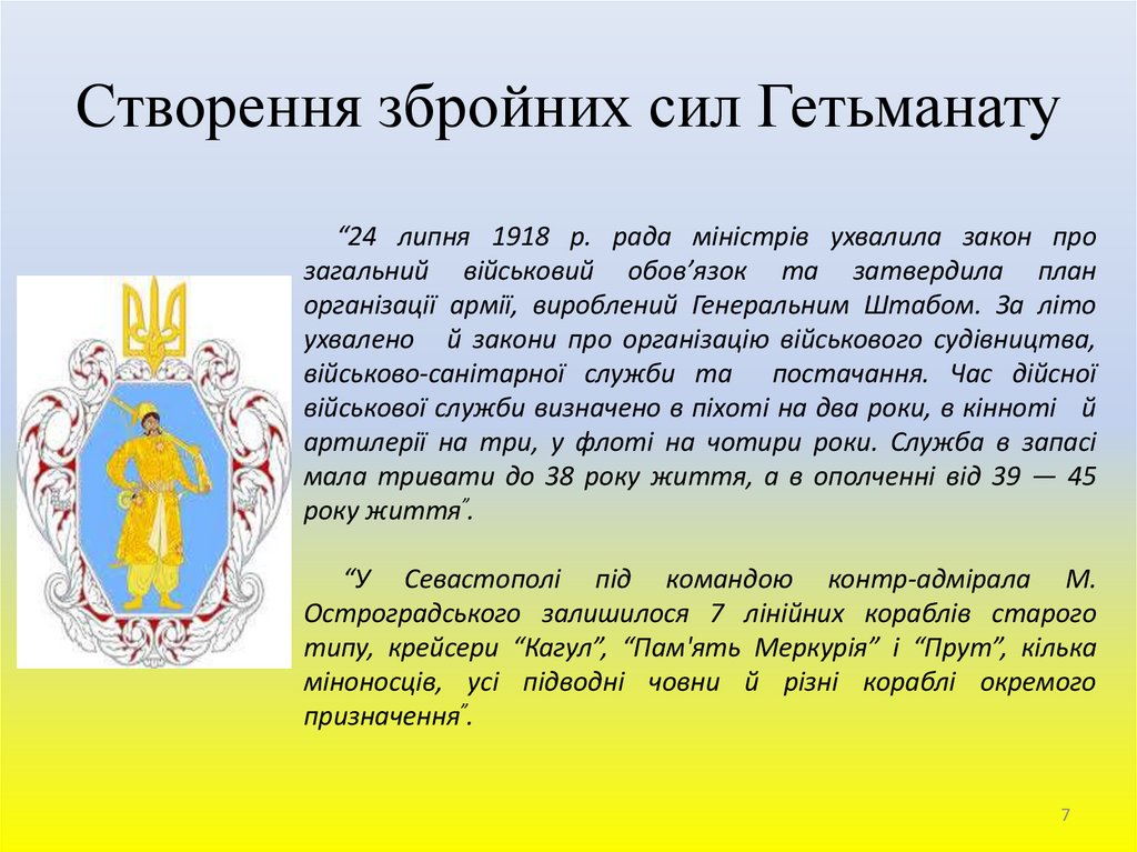 Створення збройних сил Гетьманату“24 липня 1918 р. рада міністрів ухвалила закон про