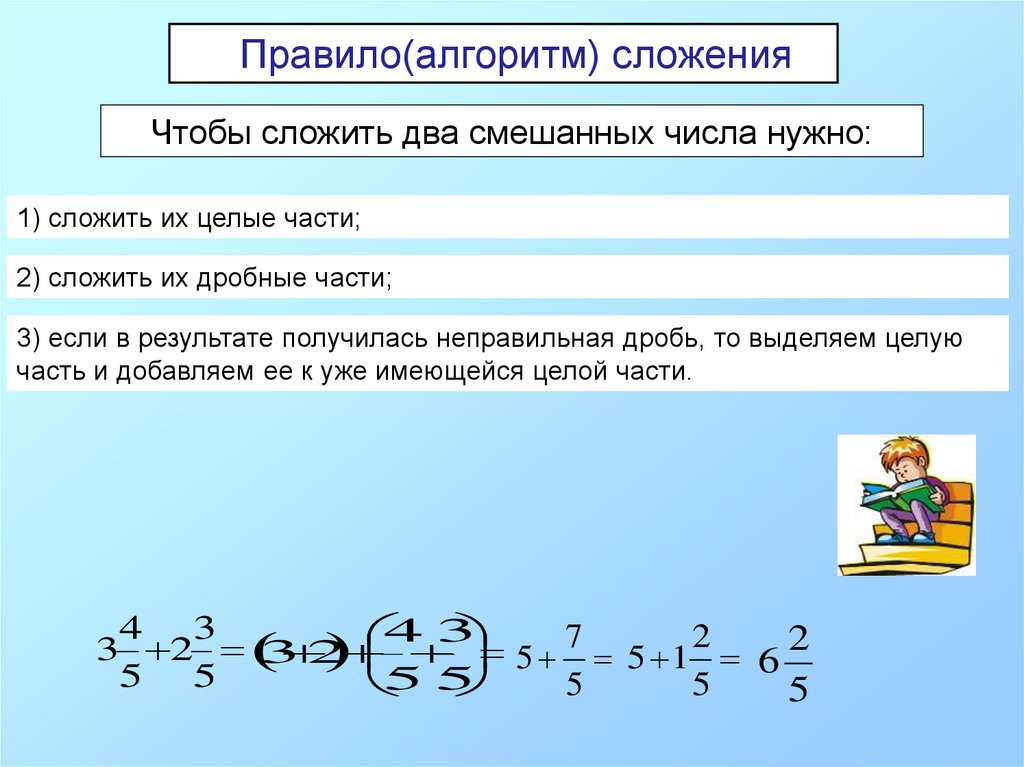 Правило(алгоритм) сложенияЧтобы сложить два смешанных числа нужно: