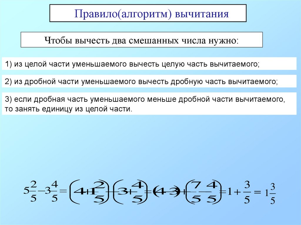 Правило(алгоритм) вычитанияЧтобы вычесть два смешанных числа нужно:
