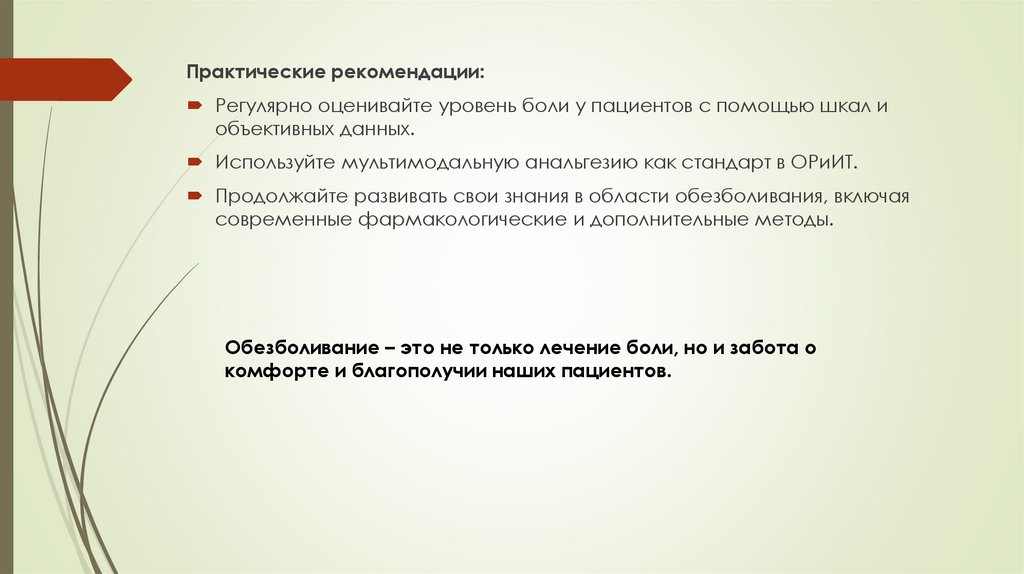 Практические рекомендации:Регулярно оценивайте уровень боли у пациентов с помощью шкал и