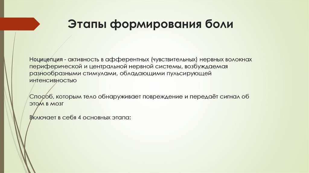 Этапы формирования болиНоцицепция - активность в афферентных (чувствительных) нервных волокнах