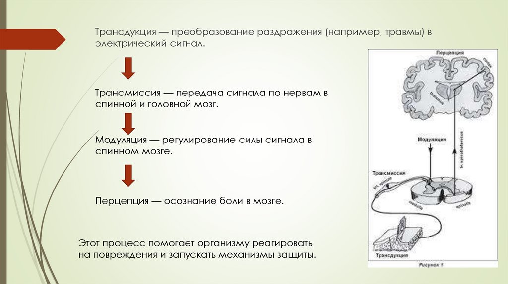Трансдукция — преобразование раздражения (например, травмы) вэлектрический сигнал.