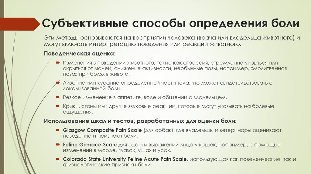 Субъективные способы определения болиЭти методы основываются на восприятии человека (врача или владельца животного) и