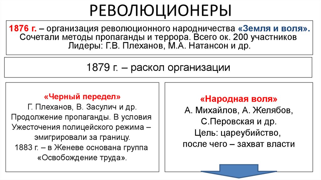 1876 г. – организация революционного народничества «Земля и воля».Сочетали методы пропаганды и террора. Всего ок. 200 участников
