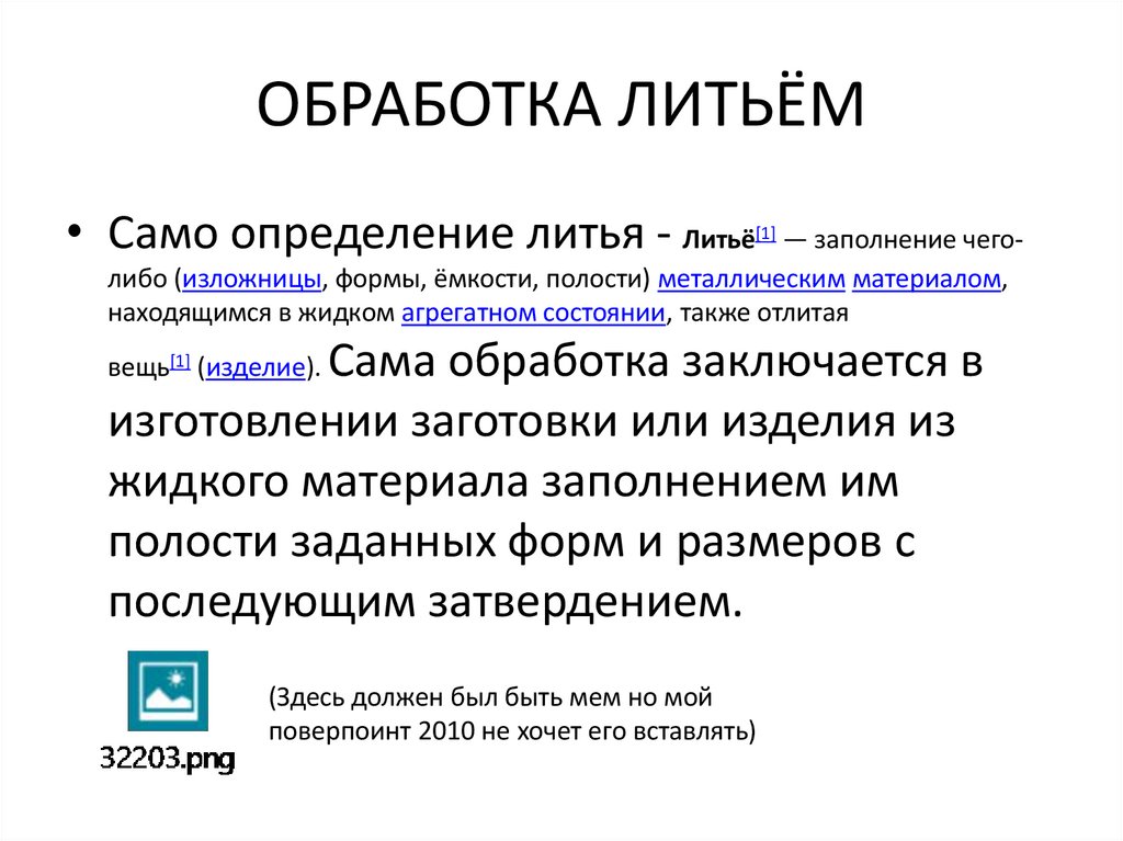 ОБРАБОТКА ЛИТЬЁМ• Само определение литья - Литьё — заполнение чего[1]