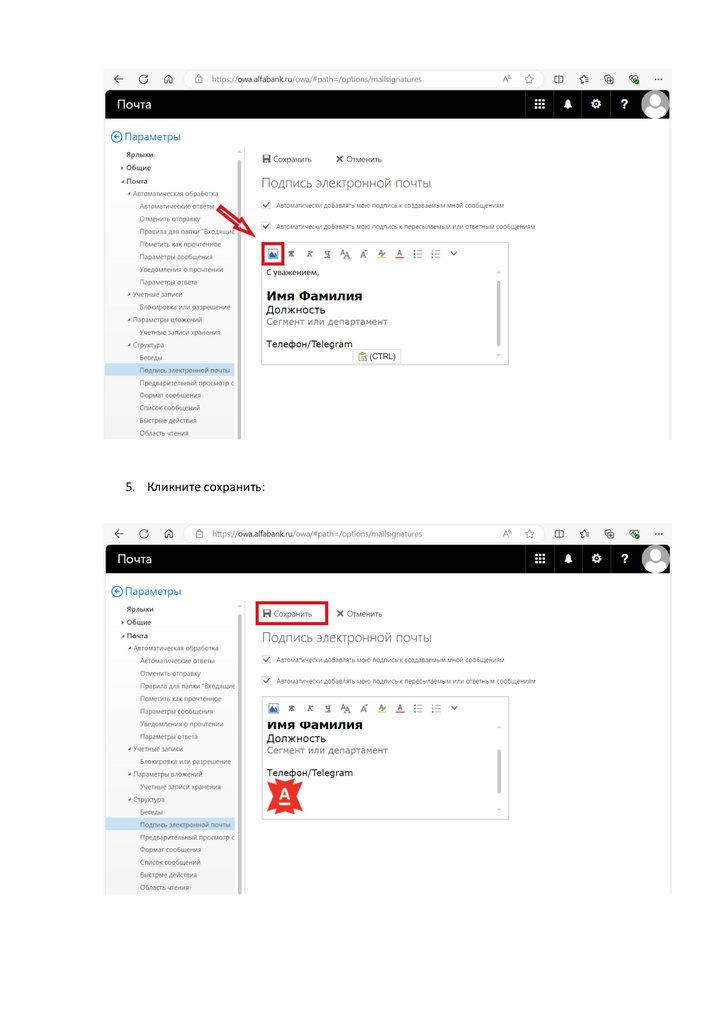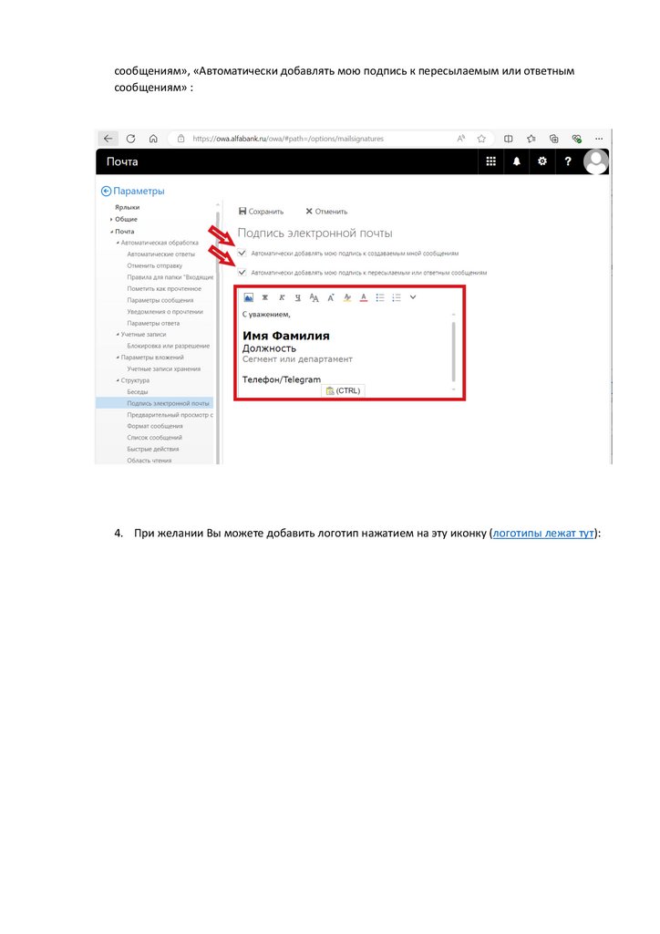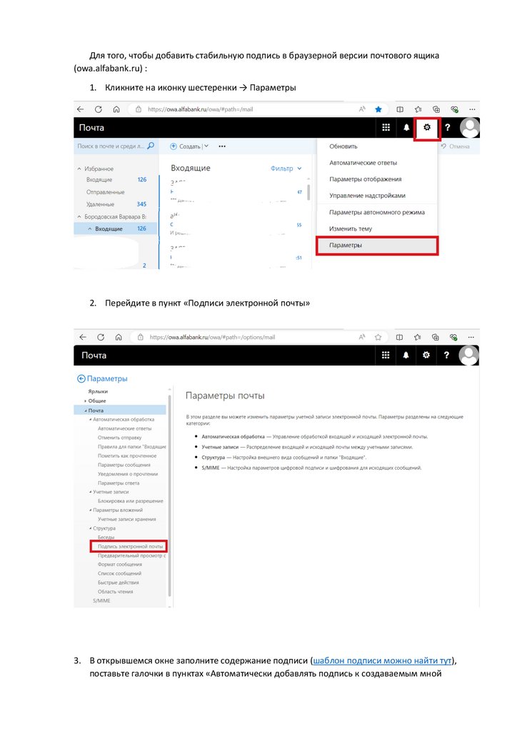 Для того, чтобы добавить стабильную подпись в браузерной версии почтового ящика(owa.alfabank.ru) :