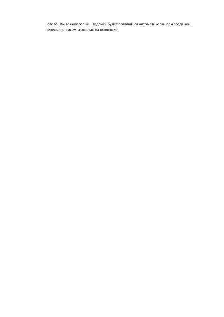 Готово! Вы великолепны. Подпись будет появляться автоматически при создании,пересылке писем и ответах на входящие.