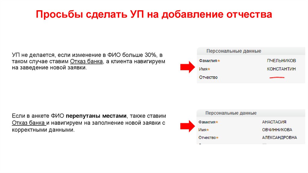 Просьбы сделать УП на добавление отчестваУП не делается, если изменение в ФИО больше 30%, в