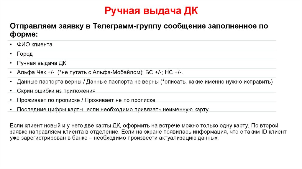 Ручная выдача ДКОтправляем заявку в Телеграмм-группу сообщение заполненное по