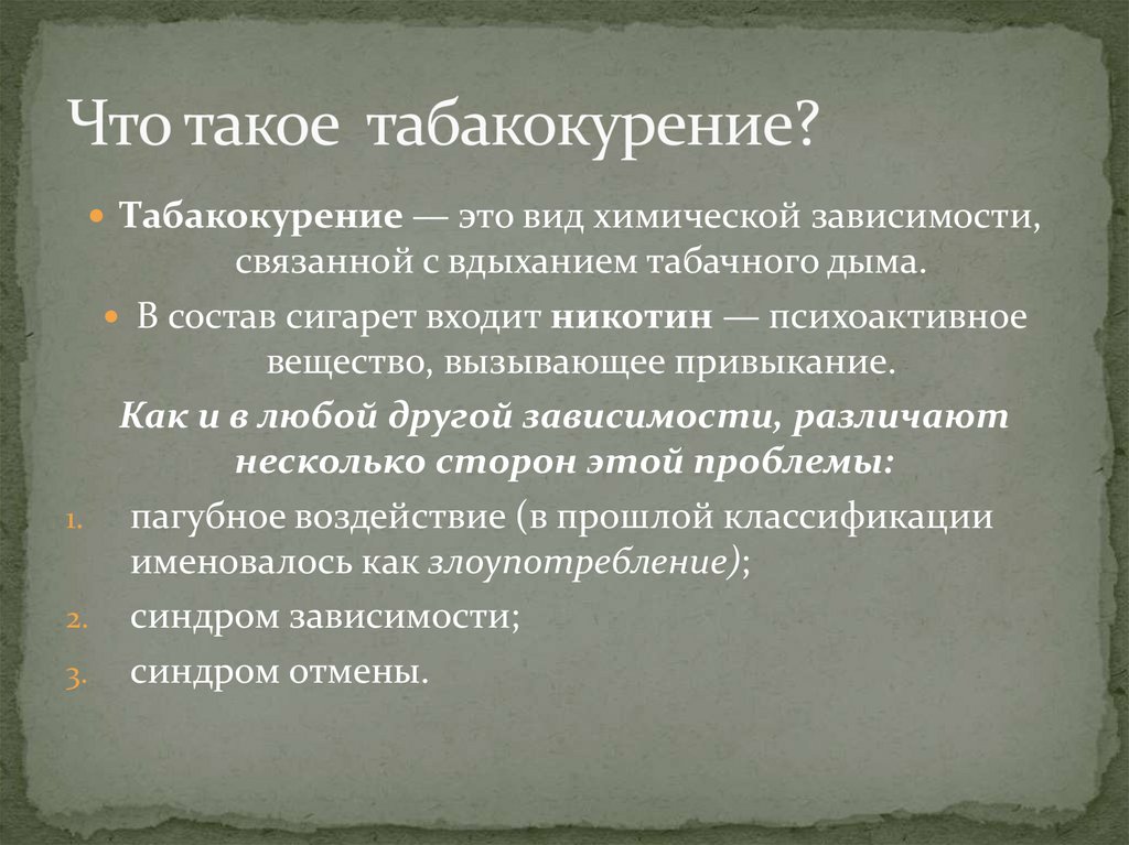 Табакокурение — это вид химической зависимости,связанной с вдыханием табачного дыма.