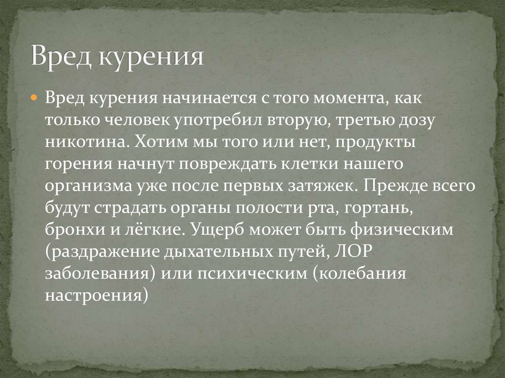 Вред курения начинается с того момента, кактолько человек употребил вторую, третью дозу