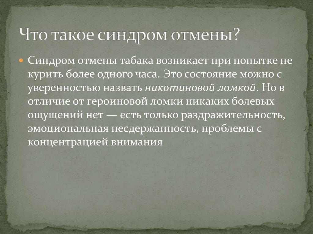 Синдром отмены табака возникает при попытке некурить более одного часа. Это состояние можно с
