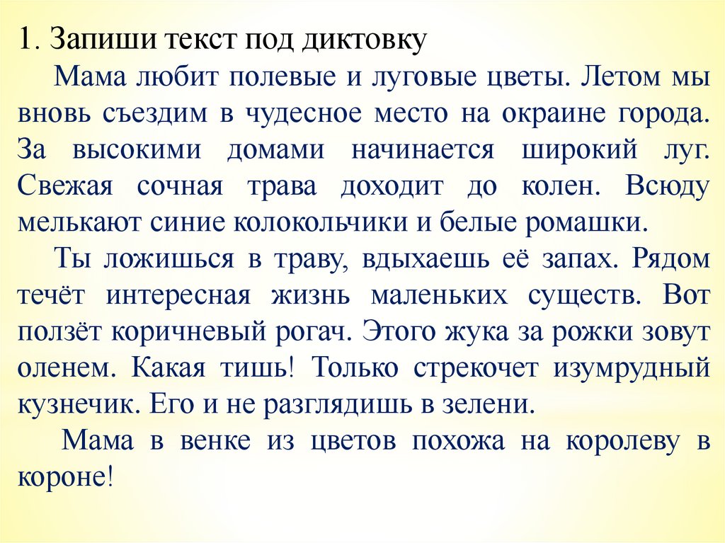 1. Запиши текст под диктовкуМама любит полевые и луговые цветы. Летом мы