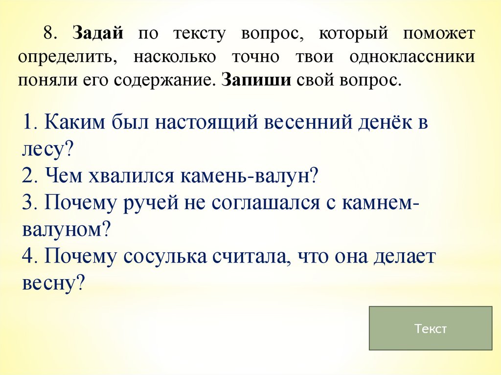 8. Задай по тексту вопрос, который поможетопределить, насколько точно твои одноклассники