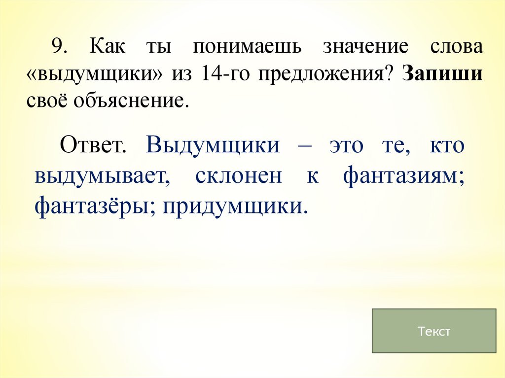 9. Как ты понимаешь значение слова«выдумщики» из 14-го предложения? Запиши